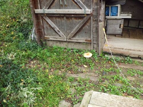 今朝、6時半頃犬の散歩に行った時は、生えていなかったと言う・・・ そのキノコ、朝は無かったんですよ。 昼過ぎに庭に出たら! 生えていた・・・・!? 様なんです・・・・・ そのキノコは・・・・・ キノコに近づこうとしたら、我が家の犬が絡んできました。 黒マメシバ雄…